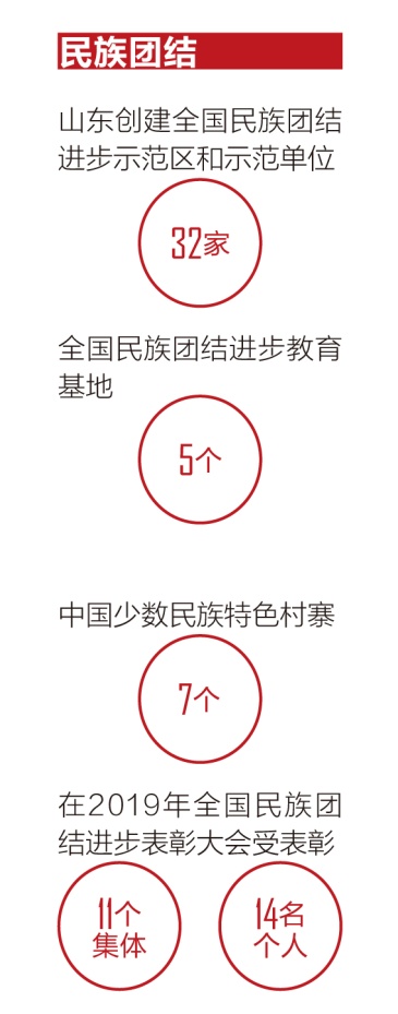 在全國(guó)率先啟動(dòng)民族團(tuán)結(jié)進(jìn)步和美家庭、示范崗位評(píng)選工作,營(yíng)造爭(zhēng)先創(chuàng)優(yōu)氛圍。連續(xù)21年開(kāi)展民族團(tuán)結(jié)進(jìn)步宣傳月活動(dòng),成為民族團(tuán)結(jié)進(jìn)步宣傳教育的特色品牌。實(shí)施城市民族工作“十有”示范社區(qū)建設(shè),開(kāi)展城市民族工作“紅石榴”品牌創(chuàng)建活動(dòng),青島市、煙臺(tái)市、濟(jì)南市歷下區(qū)先后被國(guó)家民委確定為全國(guó)少數(shù)民族流動(dòng)人口服務(wù)管理示范城市。截至目前,山東創(chuàng)建全國(guó)民族團(tuán)結(jié)進(jìn)步示范區(qū)和示范單位32家、全國(guó)民族團(tuán)結(jié)進(jìn)步教育基地5個(gè)、中國(guó)少數(shù)民族特色村寨7個(gè),在2019年全國(guó)民族團(tuán)結(jié)進(jìn)步表彰大會(huì)上有11個(gè)集體和14名個(gè)人受到表彰。