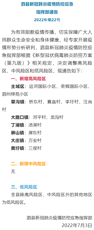今日,安徽泗縣新冠肺炎疫情防控應(yīng)急指揮部發(fā)布通告,全縣范圍內(nèi)新增13個(gè)高風(fēng)險(xiǎn)區(qū)。詳情如下:為有效阻斷疫情傳播,切實(shí)保障廣大人民群眾生命安全和身體健康,經(jīng)專家開展疫情形勢(shì)分析研判,泗縣新冠肺炎疫情防控應(yīng)急指揮部根據(jù)《新型冠狀病毒肺炎防控方案(第九版)》相關(guān)規(guī)定,決定調(diào)整高風(fēng)險(xiǎn)區(qū)、中風(fēng)險(xiǎn)區(qū)和低風(fēng)險(xiǎn)區(qū),現(xiàn)通告如下: