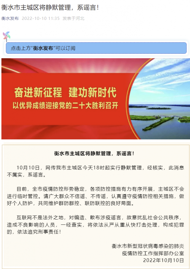 據(jù)“衡水發(fā)布”微信公眾號消息,衡水市新型冠狀病毒感染的肺炎疫情防控工作指揮部辦公室表示,10月10日,網(wǎng)傳衡水市主城區(qū)今天18時起實行靜默管理,經(jīng)核實,此消息不屬實,系謠言。