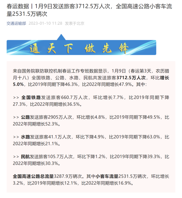 全國(guó)高速公路總流量3287.9萬(wàn)輛次。其中小客車(chē)流量2531.5萬(wàn)輛次,環(huán)比增長(zhǎng)3.2%,比2019年同期增長(zhǎng)12.1%,比2022年同期增長(zhǎng)16.9%。
