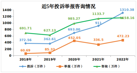 消費(fèi)者積極發(fā)揮社會監(jiān)督作用,2022年全年向市場監(jiān)管部門舉報各類違法線索472.23萬件,同比增長40.34%。
