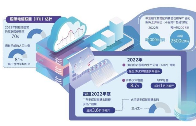 其次,中東消費(fèi)者對互聯(lián)網(wǎng)、大數(shù)據(jù)、金融科技、新能源等高科技產(chǎn)品和服務(wù)有著旺盛需求,而且有較高的收入水平和支付能力。據(jù)國際電信聯(lián)盟(ITU)估計(jì),2022年阿拉伯國家的互聯(lián)網(wǎng)使用率達(dá)70%,擁有手機(jī)的人口比例為81%,高于世界平均水平(73%)。據(jù)估計(jì),2022年,中東和北非地區(qū)消費(fèi)者在數(shù)字產(chǎn)品和服務(wù)上的支出(不包括IT基礎(chǔ)設(shè)施)約為1000億美元,預(yù)計(jì)到2027年將超過2500億美元。