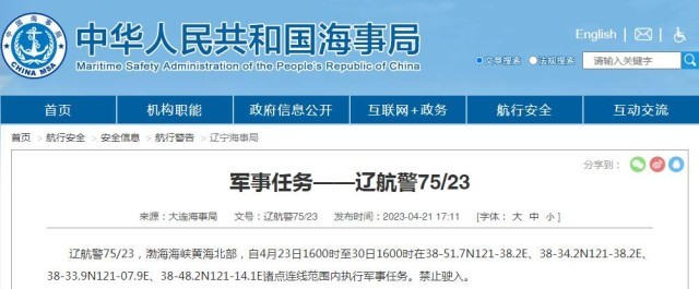大連海事局發(fā)布航行警告,4月23日16時至30日16時,渤海海峽黃海北部執(zhí)行軍事任務,禁止駛入。
