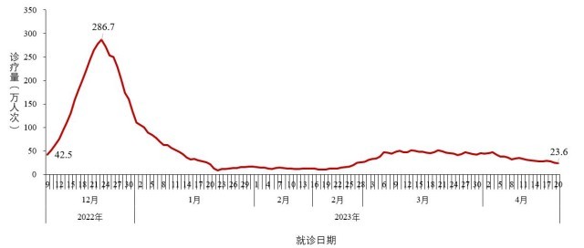 ?。ㄈ┏鞘邪l(fā)熱門診就診人數(shù)結(jié)果。全國二級以上醫(yī)療機構(gòu)和城市社區(qū)衛(wèi)生服務(wù)中心發(fā)熱門診(診室)就診人數(shù)于2022年12月22日達(dá)到峰值195.4萬人次,隨后連續(xù)下降;1月23日后呈低位波動,約6周(2月24日-4月6日)的波動增加及平臺波動后,近2周(4月7日-4月20日)呈下降趨勢,4月20日為16.8萬人次,較峰值下降了91.4%(圖2-3)。