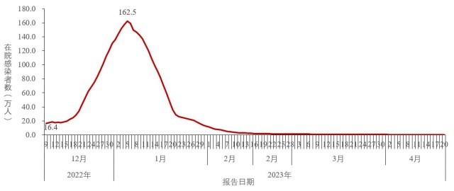 ?。ㄒ唬┰谠盒鹿诓《靖腥菊呓Y(jié)果。全國在院新冠病毒感染者于2023年1月5日達(dá)到峰值162.5萬人,隨后持續(xù)下降;4月20日下降至3929例,較峰值減少了99.8%(圖3-1)。