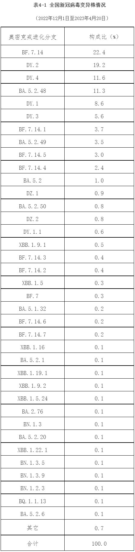 (二)12月以來本土病例病毒變異株監(jiān)測情況。2022年12月1日至2023年4月20日,全國共報送32993例本土病例新冠病毒基因組有效序列,均為奧密克戎變異株,涵蓋117個進(jìn)化分支。主要流行株為BA.5.2及其亞分支(構(gòu)成比64.3%)和BF.7及其亞分支(構(gòu)成比33.0%)等。其中,BA.5.2及其亞分支包括DY.2(19.2%)、DY.4(11.6%)、BA.5.2.48(11.3%)、DY.1(8.6%)、DY.3(5.6%)和BA.5.2.49(3.5%)等;BF.7及其亞分支包括BF.7.14(22.4%)、BF.7.14.1(3.7%)、BF.7.14.5(3.0%)、BF.7.14.4(2.4%)、BF.7.14.3(0.4%)和BF.7.14.2(0.3%)等(表4-1)。共監(jiān)測到本土重點關(guān)注變異株603例,其中,4例BQ.1、4例BQ.1.1、19例BQ.1.1.13、1例BQ.1.1.17、1例BQ.1.1.18、1例BQ.1.1.35、1例BQ.1.1.38、1例BQ.1.1.46、1例BQ.1.1.53、2例BQ.1.1.66、1例BQ.1.1.69、8例BQ.1.2、1例BQ.1.23、2例BQ.1.8、2例CH.1.1、3例CH.1.1.1、1例CH.1.1.11、1例DT.2、1例EA.1、2例EG.1、3例EL.1、7例EM.1、1例EU.1.1、2例FB.1、3例FE.1、1例XBB、4例XBB.1、2例XBB.1.11.1、1例XBB.1.12、4例XBB.1.15、42例XBB.1.16、5例XBB.1.16.1、16例XBB.1.17.1、37例XBB.1.19.1、2例XBB.1.22、22例XBB.1.22.1、1例XBB.1.23、5例XBB.1.24、1例XBB.1.4、109例XBB.1.5、2例XBB.1.5.11、9例XBB.1.5.12、2例XBB.1.5.15、7例XBB.1.5.23、35例XBB.1.5.24、1例XBB.1.5.28、1例XBB.1.5.32、1例XBB.1.5.36、1例XBB.1.5.5、2例XBB.1.5.7、2例XBB.1.9、163例XBB.1.9.1、35例XBB.1.9.2、1例XBB.1.9.3、1例XBB.1.9.5、11例XBB.2.3、1例XBB.2.3.2、1例XBB.2.4和2例XBB.3。