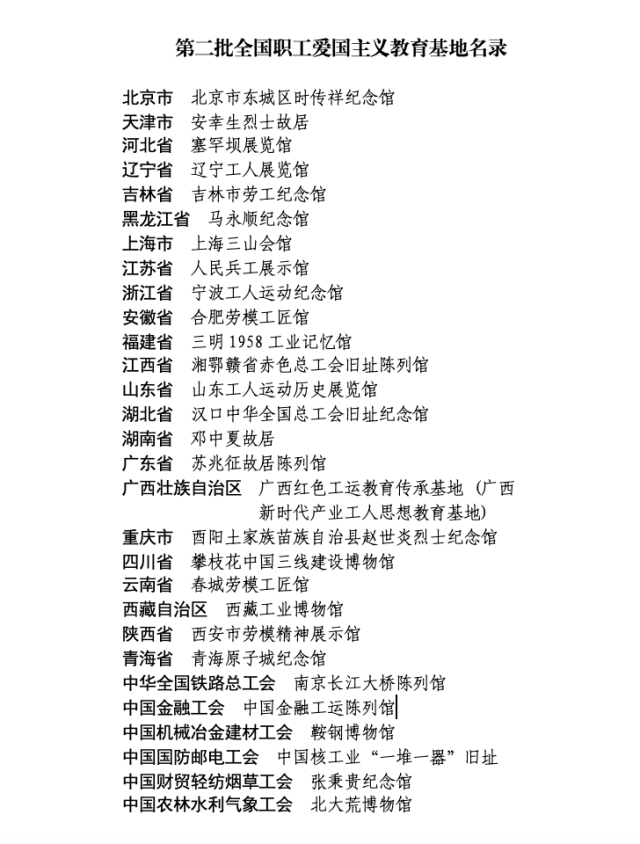 記者5月22日從全國總工會獲悉,全總命名的第二批全國職工愛國主義教育基地日前正式公布,北京市東城區(qū)時傳祥紀念館等29家單位入選。