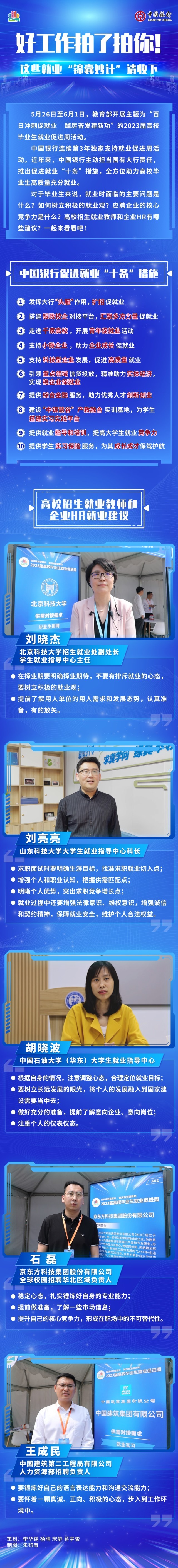 5月26日至6月1日,教育部開展主題為“百日沖刺促就業(yè)距厲奮發(fā)建新功”的2023屆高校畢業(yè)生就業(yè)促進(jìn)周活動(dòng)。中國(guó)銀行連續(xù)第3年獨(dú)家支持就業(yè)促進(jìn)周活動(dòng)。近年來,中國(guó)銀行主動(dòng)擔(dān)當(dāng)國(guó)有大行責(zé)任推出促進(jìn)就業(yè)“十條”措施,全方位助力高校畢業(yè)生高質(zhì)量充分就業(yè)。對(duì)于畢業(yè)生來說,就業(yè)時(shí)面臨的主要問題是什么? 如何樹立積極的就業(yè)觀? 應(yīng)聘企業(yè)的核心競(jìng)爭(zhēng)力是什么? 高校招生就業(yè)教師和企業(yè)HR有哪些建議? 一起來看看吧?。ㄖ袊?guó)青年網(wǎng)記者 李華錫 楊晴 宋靜 蔣宇駿 朱鈞有)