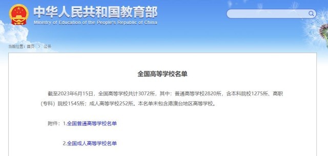 央視網(wǎng)消息:據(jù)教育部,截至2023年6月15日,全國高等學(xué)校共計(jì)3072所,其中:普通高等學(xué)校2820所,含本科院校1275所、高職(專科)院校1545所;成人高等學(xué)校252所。本名單未包含港澳臺地區(qū)高等學(xué)校。