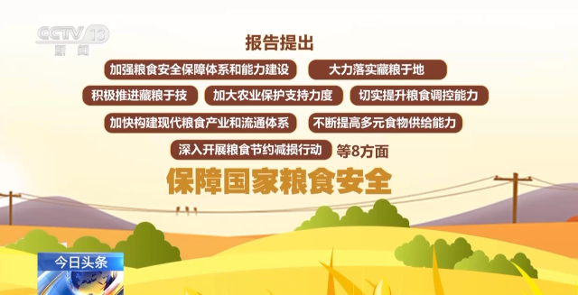報告提出,將從加強(qiáng)糧食安全保障體系和能力建設(shè)、大力落實藏糧于地、積極推進(jìn)藏糧于技、加大農(nóng)業(yè)保護(hù)支持力度、切實提升糧食調(diào)控能力、加快構(gòu)建現(xiàn)代糧食產(chǎn)業(yè)和流通體系、不斷提高多元食物供給能力、深入開展糧食節(jié)約減損行動等8方面,保障國家糧食安全。