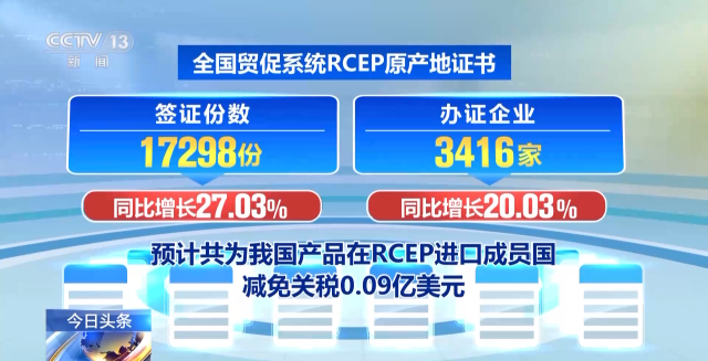 中國貿(mào)促會8月30日介紹:今年7月份,全國貿(mào)促系統(tǒng)累計簽發(fā)原產(chǎn)地證書等各類證書54.62萬份,較上年同比增長12.82%。全國貿(mào)促系統(tǒng)RCEP原產(chǎn)地證書簽證份數(shù)為17298份,同比增長27.03%;辦證企業(yè)3416家,同比增長20.03%,預(yù)計共為我國產(chǎn)品在RCEP進(jìn)口成員國減免關(guān)稅0.09億美元。
