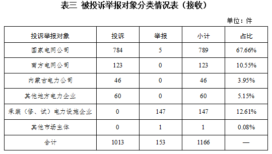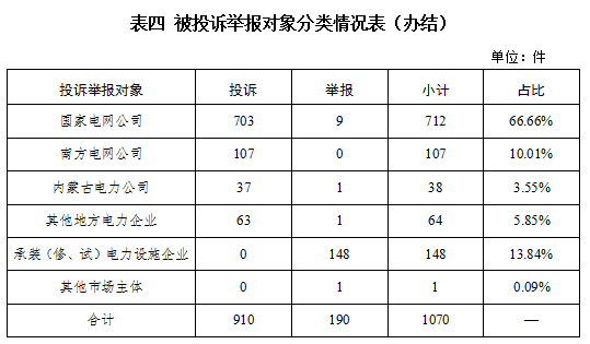 從被投訴舉報(bào)對象看,供電企業(yè)921件、占投訴舉報(bào)總數(shù)的86.07%,其中國家電網(wǎng)公司712件、占比66.66%,南方電網(wǎng)公司107件、占比10.01%,內(nèi)蒙古電力公司38件、占比3.55%,其他地方電力企業(yè)64件、占比5.85%;承裝(修、試)電力設(shè)施企業(yè)148件、占比13.84%;其他市場主體1件、占比0.09%。