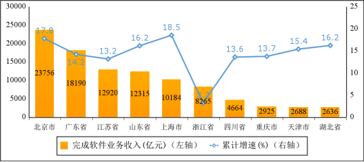 京津冀地區(qū)增勢(shì)突出,長(zhǎng)三角地區(qū)軟件業(yè)務(wù)收入穩(wěn)中有升。1—11月份,京津冀地區(qū)完成軟件業(yè)務(wù)收入26862億元,同比增長(zhǎng)17.6%,增速較1—10月份提高0.1個(gè)百分點(diǎn);長(zhǎng)三角地區(qū)完成軟件業(yè)務(wù)收入32296億元,同比增長(zhǎng)12.2%,增速較1—10月份提高1.6個(gè)百分點(diǎn)。兩個(gè)地區(qū)軟件業(yè)務(wù)收入在全國(guó)總收入中的占比分別為24.3%、29.2%。