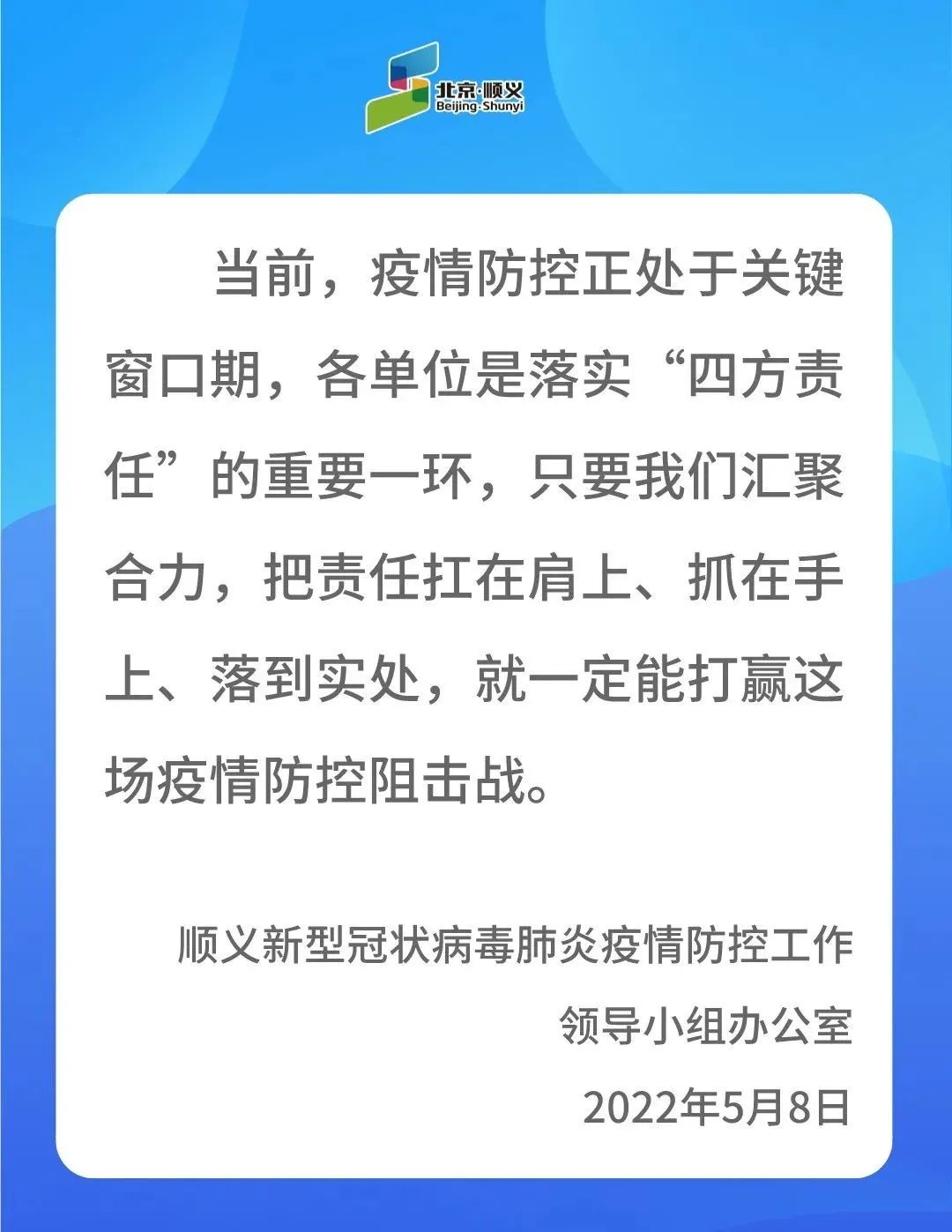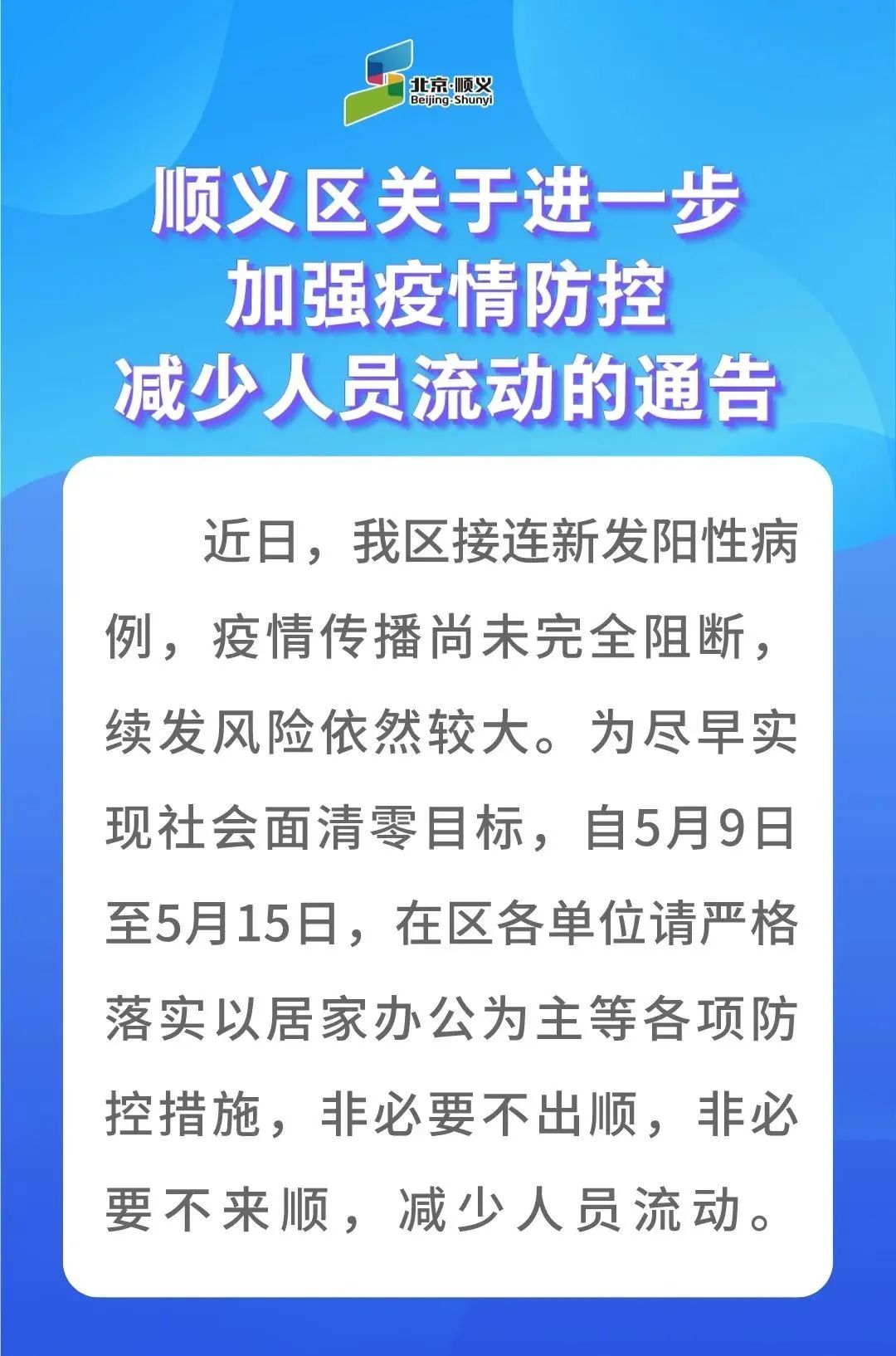 中新網(wǎng)5月8日電 據(jù)“北京順義”微信公眾號消息,5月8日,順義區(qū)發(fā)布《順義區(qū)關(guān)于進(jìn)一步加強(qiáng)疫情防控減少人員流動的通告》指出,為盡早實現(xiàn)社會面清零目標(biāo),自5月9日至5月15日,在區(qū)各單位請嚴(yán)格落實以居家辦公為主等各項防控措施,非必要不出順,非必要不來順,減少人員流動。