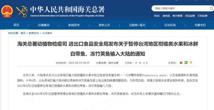 各海關(guān)自2022年8月3日起暫停受理臺(tái)灣地區(qū)柑橘類水果和冰鮮白帶魚(yú)、凍竹莢魚(yú)報(bào)關(guān),并及時(shí)將上述情況通知轄區(qū)內(nèi)相關(guān)企業(yè)。(中新財(cái)經(jīng))