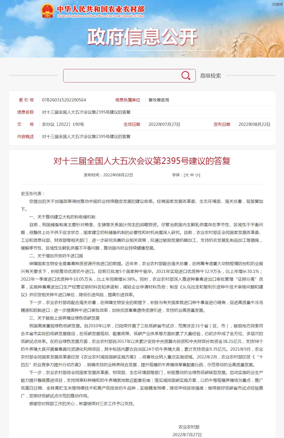 中新網(wǎng)8月23日電 農(nóng)業(yè)農(nóng)村部網(wǎng)站8月22日公布《對十三屆全國人大五次會議第2395號建議的答復》。關(guān)于推動建立大包奶粉收儲機制,農(nóng)業(yè)農(nóng)村部在答復中稱,目前,我國儲備制度主要針對糧食、生豬等關(guān)系國計民生的戰(zhàn)略物資。盡管當前國內(nèi)生鮮乳供需存在季節(jié)性、區(qū)域性不平衡問題,但整體上處于供不應求狀態(tài),國家建立奶粉儲備機制的必要性和時機尚需深入研究。目前,農(nóng)業(yè)農(nóng)村部正會同國家發(fā)展改革委、工業(yè)和信息化部、財政部等相關(guān)部門,進一步研究完善奶業(yè)相關(guān)政策,擬通過鼓勵發(fā)展奶酪加工、支持奶農(nóng)發(fā)展乳制品加工等措施,緩解季節(jié)性、區(qū)域性生鮮乳供需不平衡問題,推動國內(nèi)奶業(yè)持續(xù)健康發(fā)展。(中新財經(jīng))
