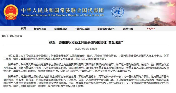 中新網(wǎng)8月23日電 據(jù)中國常駐聯(lián)合國代表團網(wǎng)站消息,中國常駐聯(lián)合國代表張軍大使在聯(lián)合國安理會的公開會上指出,尊重各國主權和領土完整是實現(xiàn)共同安全的基礎,是國與國交往的“黃金法則”。