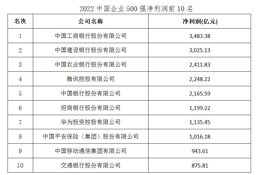 凈利潤前10名為工商銀行、建設(shè)銀行、農(nóng)業(yè)銀行、騰訊、中國銀行、招商銀行、華為、中國平安、中國移動(dòng)、交通銀行。