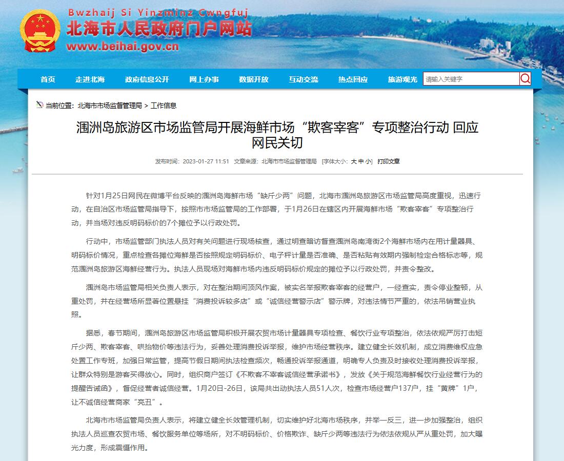 中新網(wǎng)1月28日電 據(jù)北海市市場(chǎng)監(jiān)督管理局網(wǎng)站27日消息,針對(duì)1月25日網(wǎng)民在微博平臺(tái)反映的潿洲島海鮮市場(chǎng)“缺斤少兩”問(wèn)題,北海市潿洲島旅游區(qū)市場(chǎng)監(jiān)管局高度重視,迅速行動(dòng),在自治區(qū)市場(chǎng)監(jiān)管局指導(dǎo)下,按照市市場(chǎng)監(jiān)管局的工作部署,于1月26日在轄區(qū)內(nèi)開(kāi)展海鮮市場(chǎng)“欺客宰客”專項(xiàng)整治行動(dòng),并當(dāng)場(chǎng)對(duì)違反明碼標(biāo)價(jià)的7個(gè)攤位予以行政處罰。