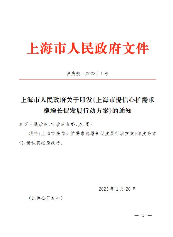 中新網(wǎng)1月29日電 據(jù)上海發(fā)布微信公眾號29日消息,為全面貫徹黨的二十大和中央經(jīng)濟(jì)工作會議精神,落實市第十二次黨代會和十二屆市委二次全會部署,抓牢高質(zhì)量發(fā)展首要任務(wù),大力提振市場預(yù)期和信心,推動經(jīng)濟(jì)社會發(fā)展開好局起好步,近期上海市制定了《上海市提信心擴需求穩(wěn)增長促發(fā)展行動方案》(以下簡稱《行動方案》)。