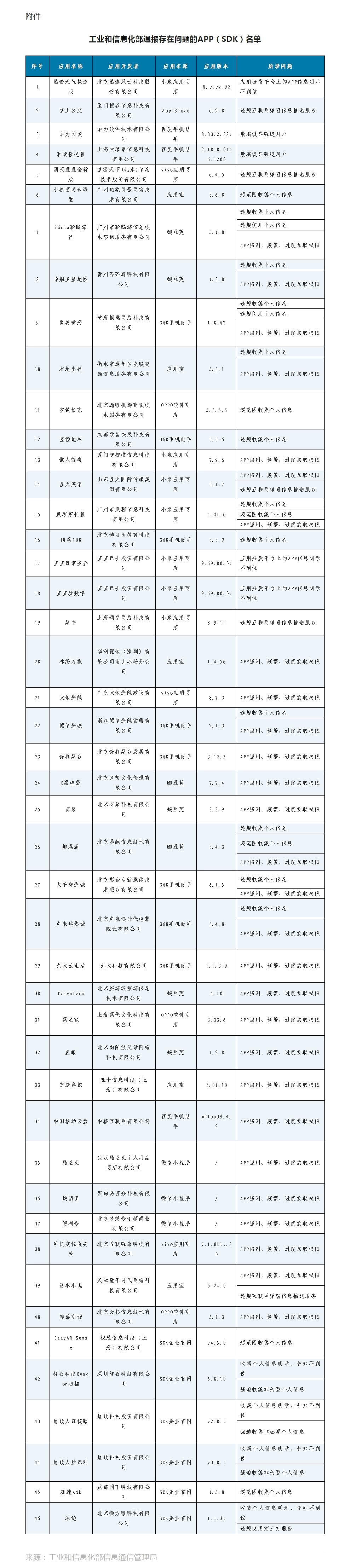 工信部通報46款存在侵害用戶權益行為APP(SDK)