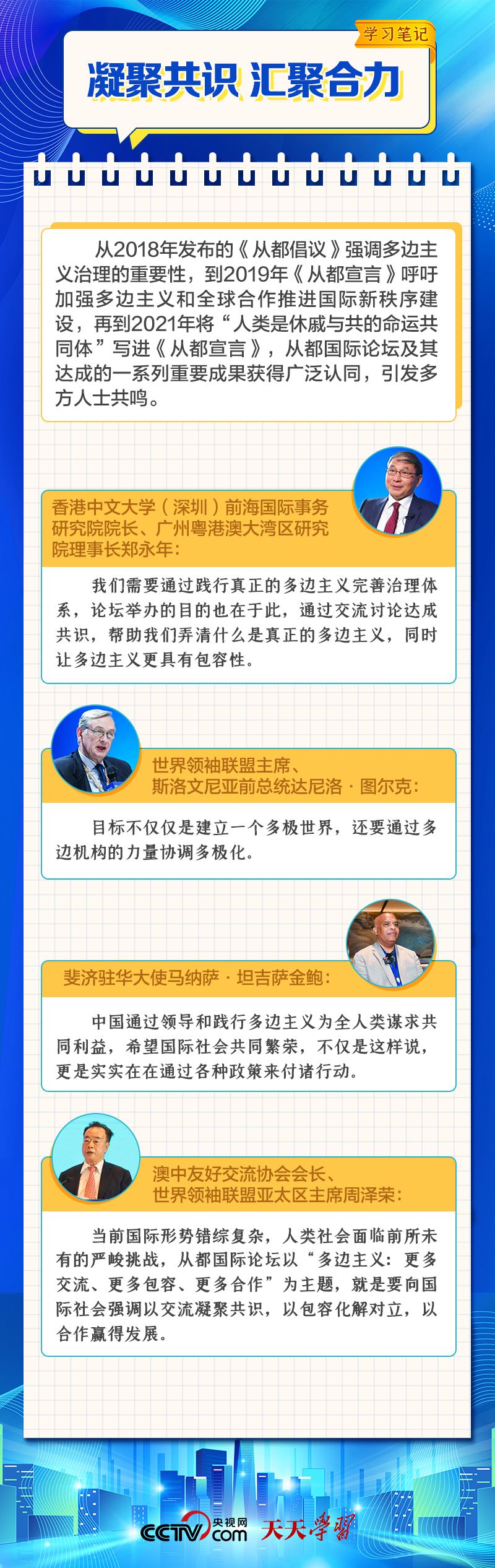 天天學(xué)習 12月4日,習近平主席在致“2023從都國際論壇”的賀信中強調(diào),面對前所未有的世界之變、時代之變和歷史之變,人類社會必須團結(jié)起來,堅持互學(xué)互鑒、開放包容、合作共贏,弘揚全人類共同價值,共同建設(shè)更加美好的世界。