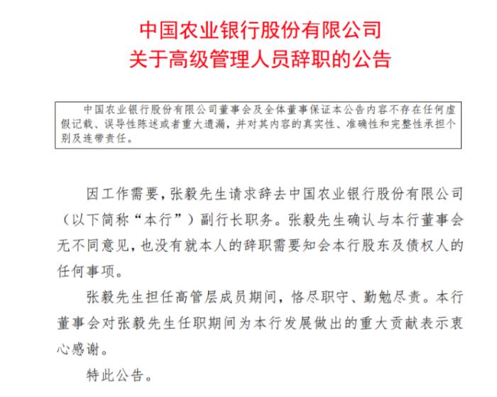 中國農(nóng)業(yè)銀行也人事變動不斷。21日,農(nóng)行公告稱,因工作需要,張毅請求辭去中國農(nóng)業(yè)銀行副行長職務。