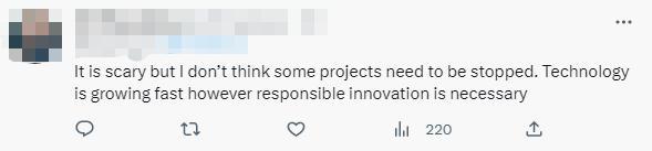 還有人分析,“這很可怕,但我認(rèn)為有些項目不需要停止。技術(shù)正在發(fā)展迅速,負(fù)責(zé)任的創(chuàng)新也是必要的?!?/p>