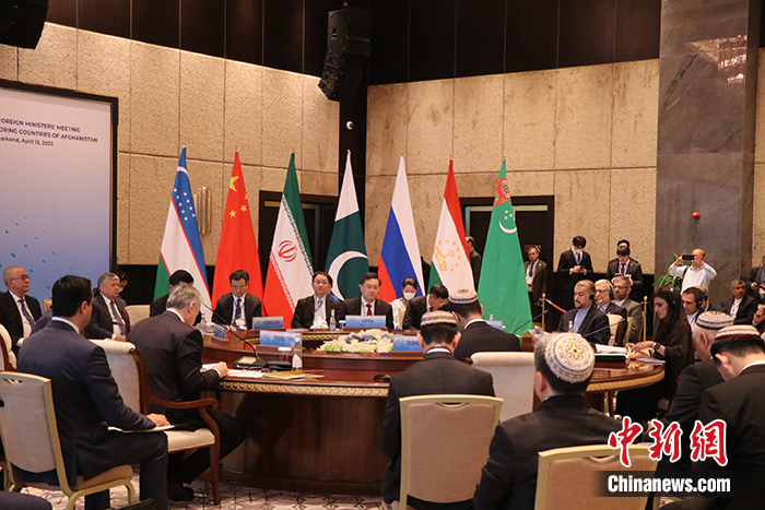 當(dāng)?shù)貢r(shí)間4月13日,烏茲別克斯坦撒馬爾罕,第四次阿富汗鄰國外長會舉行。 中新社記者 張碩 攝