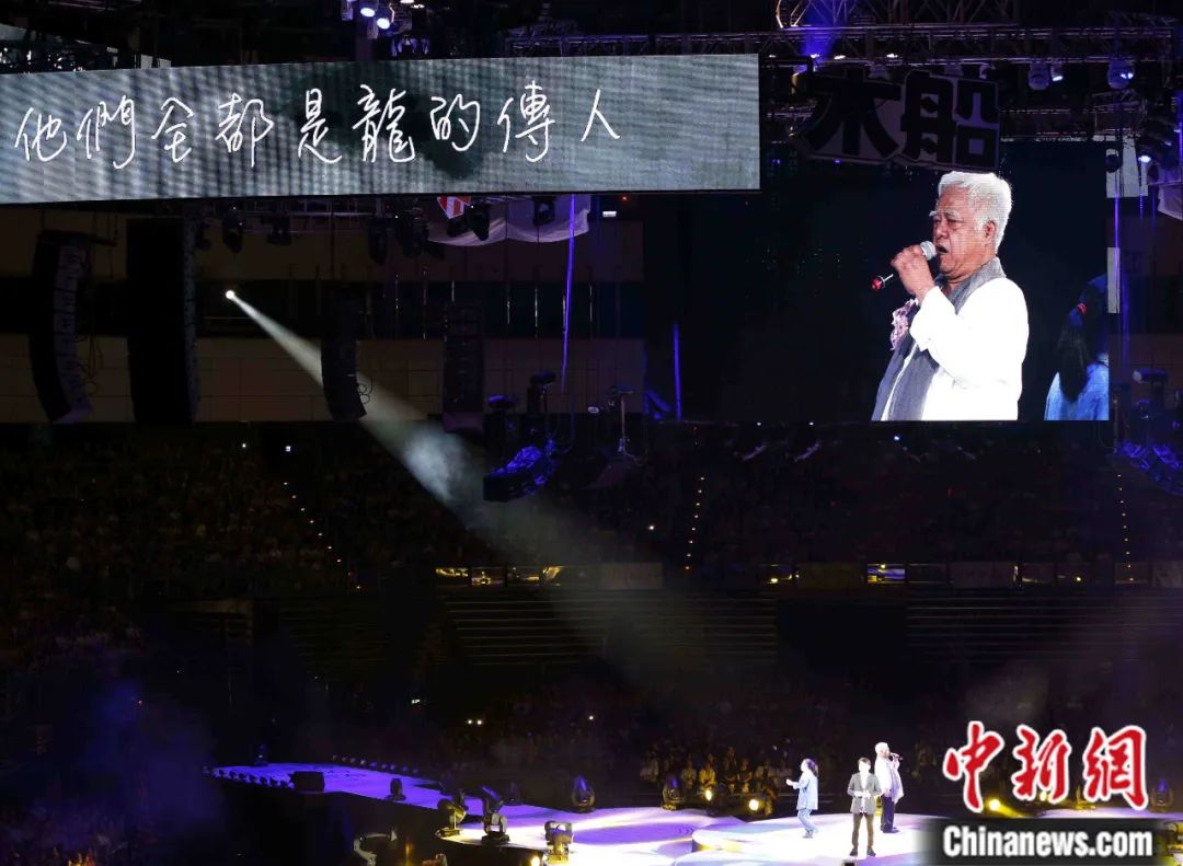 2015年6月,“民歌40:再唱一段思想起”演唱會(huì)在臺(tái)北小巨蛋舉行。包括齊豫、李宗盛、潘越云在內(nèi)的幾十位知名歌手齊聚一堂,共同紀(jì)念臺(tái)灣民歌運(yùn)動(dòng)興起40周年。圖為胡德夫等人合唱《龍的傳人》。鄭巧 攝