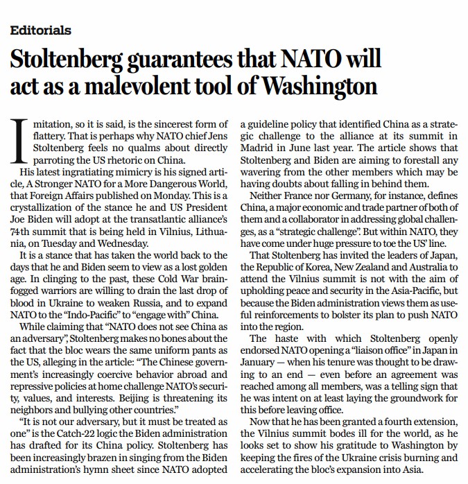 他最近的模仿是于7月10日在《外交事務》上發(fā)表題為《更強大的北約,應對更危險的世界》的署名文章,字里行間透露了他和美國總統拜登在北約峰會上的立場。為了固守過去,這些頭腦昏昏的冷戰(zhàn)“斗士”寧愿讓烏克蘭流盡最后一滴血,以削弱俄羅斯,并將北約擴大到所謂“印太”地區(qū),遏制中國。