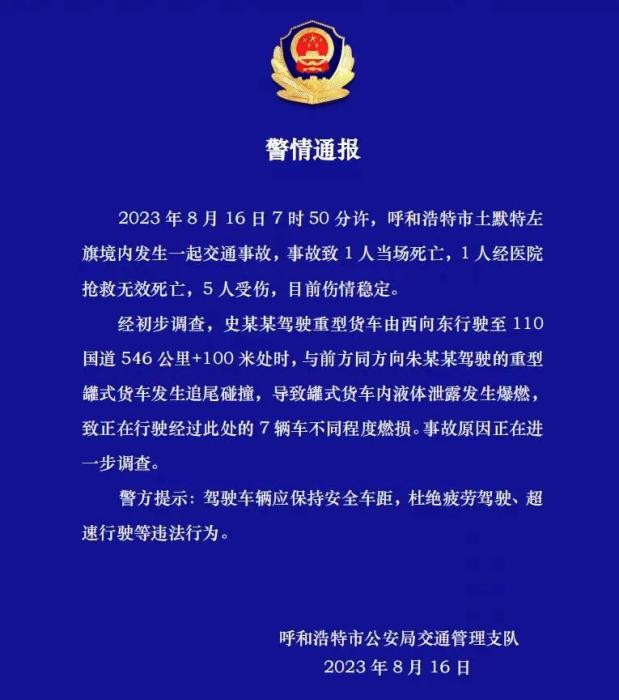 經(jīng)初步調(diào)查,史某某駕駛重型貨車由西向東行駛至110國道546公里+100米處時,與前方同方向朱某某駕駛的重型罐式貨車發(fā)生追尾碰撞,導致罐式貨車內(nèi)液體泄露發(fā)生爆燃,致正在行駛經(jīng)過此處的7輛車不同程度燃損。事故原因正在進一步調(diào)查。