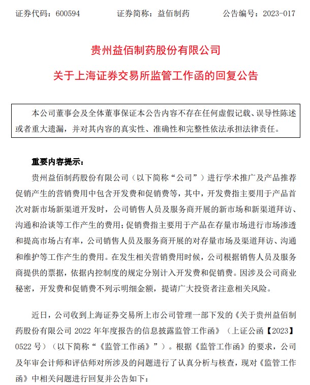 2023年6月,益佰制藥收到上交所年報監(jiān)管函,被要求補充披露銷售費用前五大支付對象;學術推廣、營銷平臺建設等市場費用主要核算內(nèi)容明細情況;銷售費用支付對象中是否涉及公司經(jīng)銷商、關聯(lián)方或其他利益相關方等相關信息。