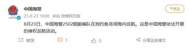 中新網(wǎng)8月23日電 據(jù)中國海警局官方微博消息,8月23日,中國海警2502艦艇編隊(duì)在中國釣魚島領(lǐng)海內(nèi)巡航。這是中國海警依法開展的維權(quán)巡航活動。