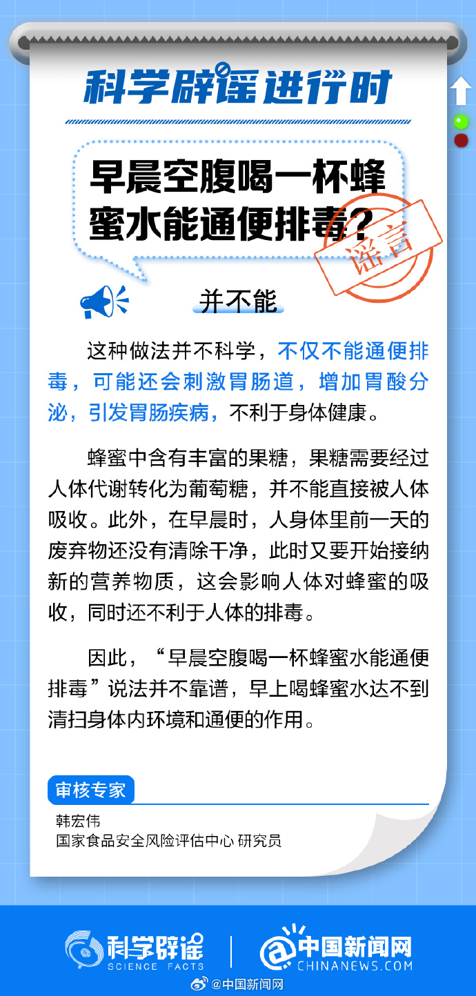 中新網(wǎng)8月22日電 早晨空腹喝蜂蜜水不僅不能通便排毒,可能還會刺激胃腸道,增加胃酸分泌,引發(fā)胃腸疾病。蜂蜜中含有豐富的果糖,果糖需要經(jīng)過人體代謝轉(zhuǎn)化為葡萄糖,并不能直接被人體吸收。在早晨,人身體里前一天的廢棄物還沒有清除干凈,此時又要開始接納新的營養(yǎng)物質(zhì),這會影響人體對蜂蜜的吸收,還不利于人體的排毒。(來源:@科學辟謠 @中國新聞網(wǎng) )