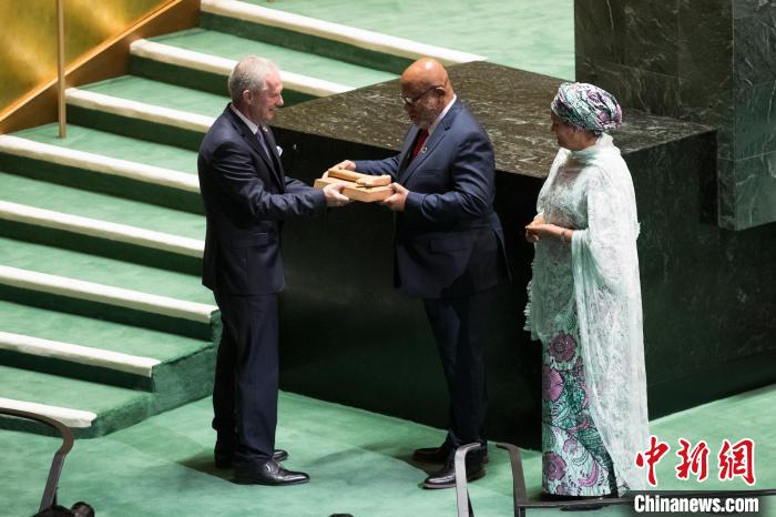 當(dāng)?shù)貢r間9月5日,第77屆聯(lián)合國大會在紐約聯(lián)合國總部閉幕。在聯(lián)合國常務(wù)副秘書長阿明娜(右)的見證下,第77屆聯(lián)大主席克勒希(左一)將象征聯(lián)大主席權(quán)力的議事槌交給第78屆聯(lián)大主席弗朗西斯(中)。中新社記者 廖攀 攝
