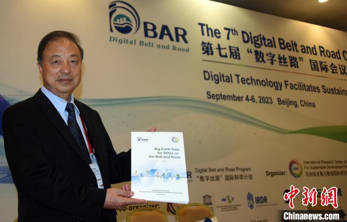 9月4日,第七屆“數(shù)字絲路”國際會議在北京開幕,DBAR主席郭華東院士展示當天最新發(fā)布的《地球大數(shù)據(jù)助力“一帶一路”可持續(xù)發(fā)展》報告。中新網(wǎng)記者 孫自法 攝
