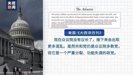 美國(guó)《大西洋月刊》評(píng)論說,現(xiàn)在眾議院沒有議長(zhǎng)了,接下來會(huì)出現(xiàn)更多混亂。雖然共和黨仍是眾議院多數(shù)黨,但它是一個(gè)嚴(yán)重分裂、功能失調(diào)的政黨。