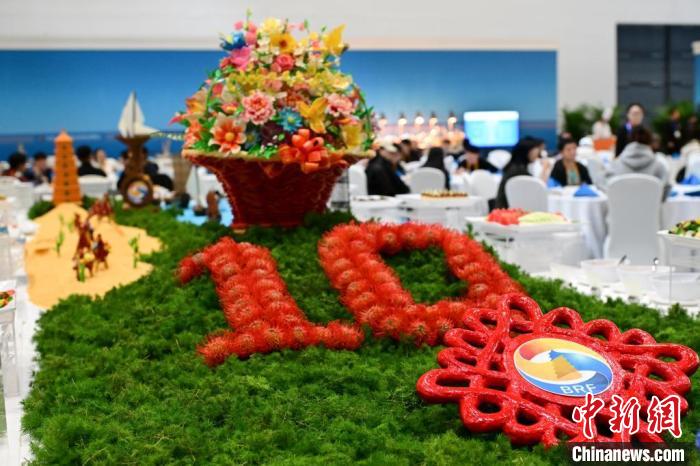 論壇新聞中心大門兩側(cè)擺放著兩塊主題燈光展板,走近細(xì)看,航行在大海中的帆船、在沙漠中行走的駱駝、“一帶一路”共建國(guó)家標(biāo)志性建筑物等多個(gè)具有象征意義的圖案細(xì)節(jié)盡在其中。在餐廳中央取餐臺(tái)上,代表著共建“一帶一路”倡議10周年的數(shù)字“10”,和祈年殿等中國(guó)古建筑物代表性元素也都精妙地融于一體。