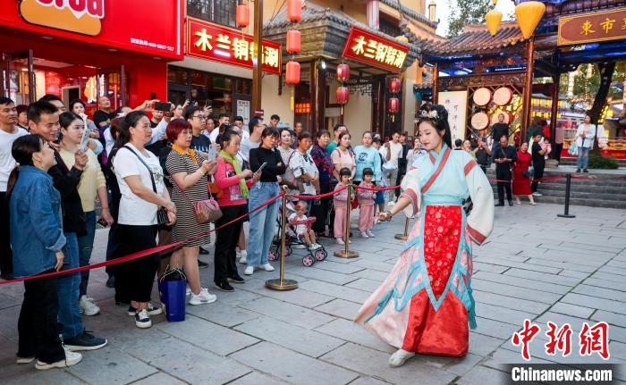 10月18日,游客在木蘭不夜城觀看演出。張暢 攝
