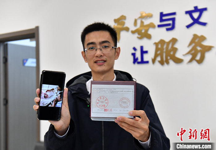 圖為新生兒父親展示女兒照片和帶有“河北雄安新區(qū)”字樣的戶口頁(yè)。 中新社記者 韓冰 攝