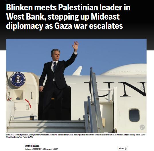 據(jù)報(bào)道,這是本輪巴以沖突爆發(fā)以來,美國(guó)最高級(jí)別外交官首次到訪約旦河西岸。