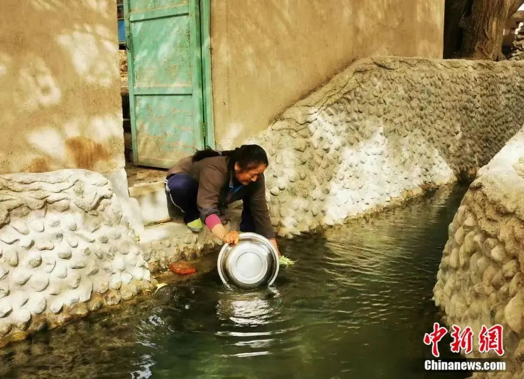 居民在坎兒井明渠洗菜。圖片來(lái)自吐魯番零距離