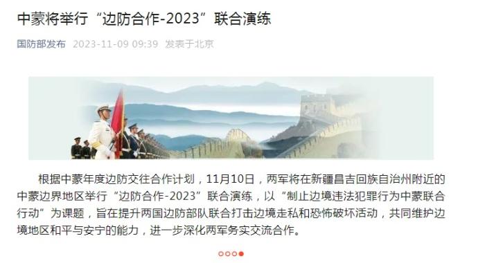 中新網11月9日電 據國防部發(fā)布微信公眾號消息,根據中蒙年度邊防交往合作計劃,11月10日,兩軍將在新疆昌吉回族自治州附近的中蒙邊界地區(qū)舉行“邊防合作-2023”聯合演練,以“制止邊境違法犯罪行為中蒙聯合行動”為課題,旨在提升兩國邊防部隊聯合打擊邊境走私和恐怖破壞活動,共同維護邊境地區(qū)和平與安寧的能力,進一步深化兩軍務實交流合作。