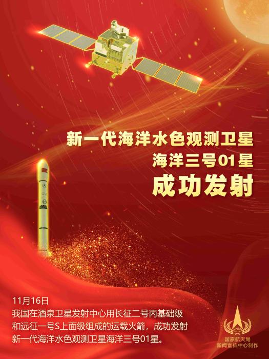 中新網(wǎng)酒泉11月16日電 (馬帥莎 張未)11月16日11時55分,中國在酒泉衛(wèi)星發(fā)射中心用長征二號丙基礎(chǔ)級和遠(yuǎn)征一號S上面級組成的運載火箭,成功發(fā)射新一代海洋水色觀測衛(wèi)星海洋三號01星。該衛(wèi)星指標(biāo)達(dá)到國際水色遙感衛(wèi)星先進(jìn)水平,可滿足中國海洋環(huán)境監(jiān)測的主體業(yè)務(wù)需求,并能夠服務(wù)于生態(tài)文明建設(shè)、智慧海洋工程建設(shè)、“一帶一路”倡議等國家重大戰(zhàn)略需求。