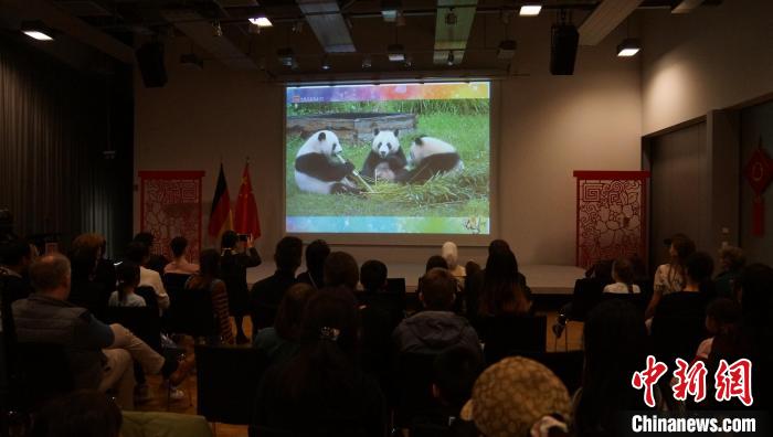 圖為現(xiàn)場(chǎng)播放柏林動(dòng)物園大熊貓雙胞胎成長紀(jì)錄片。柏林中國文化中心供圖