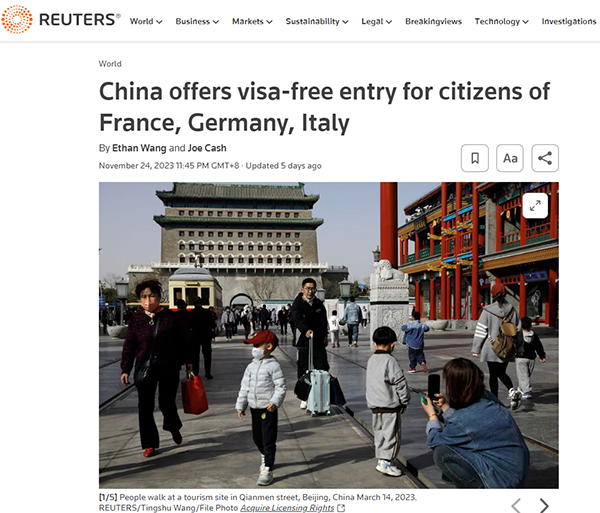 路透社報(bào)道稱,中國(guó)外交部宣布,2023年12月1日至2024年11月30日期間,上述國(guó)家持普通護(hù)照人員來華經(jīng)商、旅游觀光、探親訪友和過境不超過15天,可免辦簽證入境。