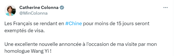 法國(guó)外長(zhǎng)科隆納也表示:“我的同事王毅在我訪問之際宣布了一個(gè)很棒的消息!前往中國(guó)停留不超過15天的法國(guó)人將免簽?!?/p>