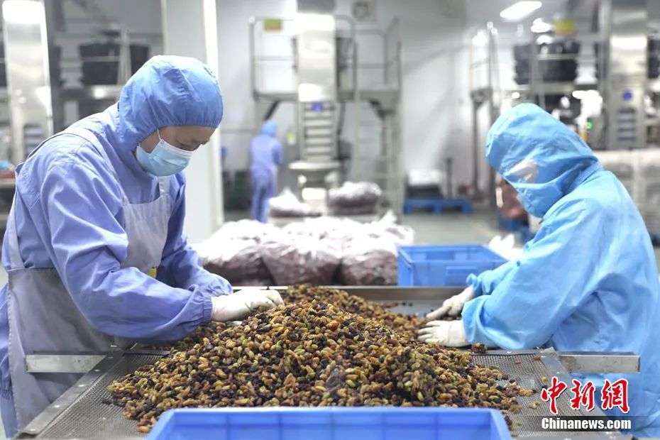 圖為工人正在篩選葡萄干。石芙蓉 攝