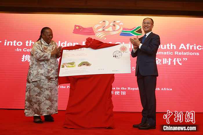 當(dāng)?shù)貢r(shí)間12月12日,中國駐南非大使館隆重舉行慶祝中國和南非建交25周年招待會(huì)。圖為中國駐南非大使陳曉東同南非外長潘多爾為中南建交25周年紀(jì)念封揭幕。 中新社記者 王曦 攝